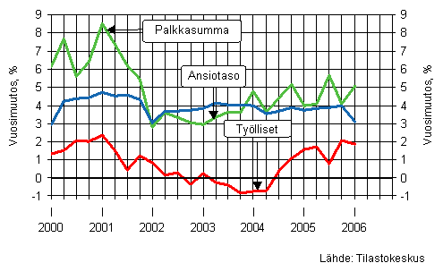 Työllisyys kääntyi nousuun vuoden 2004 kolmannella vuosineljänneksellä ja kasvu on kiihtynyt ollen 2006 ensimmäisellä vuosineljänneksellä 1,9 prosenttia suurempi kuin vuotta aikaisemmin vastaavana ajanjaksona. Parantunut työllisyystilanne näkyy myös palkkasummien kehityksessä. Vuoden 2005 kolmannella neljänneksellä ja vuoden 2006 ensimmäisellä neljänneksellä palkkasumman kasvua kiihdyttivät tulospalkkiot. Vuoden 2006 ensimmäisellä vuosineljänneksellä ansiotasoindeksin kasvu hidastui aiemmasta.