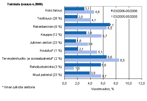 Palkkasumman vuosimuutos ajanjaksolla 03/2006-05/2006 ja 03/2005-05/2005, %