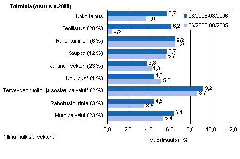 Palkkasumman vuosimuutos ajanjaksolla 06/2006-08/2006 ja 06/2005-08/2005, %