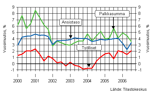 Koko talouden palkkasumma oli vuoden 2006 syys-marraskuussa 4,7 prosenttia suurempi kuin vuotta aiemmin vastaavana ajanjaksona. Kasvu hidastui edellisvuodesta, jolloin syys-marraskuun muutos oli 5,6 prosenttia.