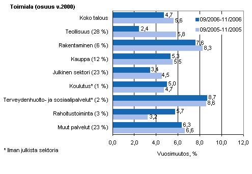 Palkkasumman vuosimuutos ajanjaksolla 09/2006-11/2006 ja 09/2005-11/2005, %