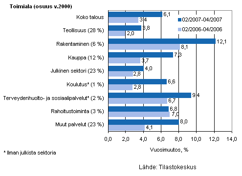 Palkkasumman vuosimuutos ajanjaksolla 2/2007-4/2007 ja 2/2006-4/2006, %