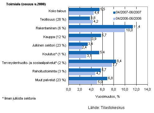 Julkisen sektorin maksama palkkasumma kasvoi 3,4 prosenttia vuoden 2007 toisella neljänneksellä. Vuotta aiemmin vastaavana ajanjaksona julkisen sektorin palkkasumma kasvoi 2,4 prosenttia. Yksityisten terveydenhuolto- ja sosiaalipalvelujen palkkasumman kasvoi 8,4 prosenttia huhti-kesäkuussa, yksityisen koulutuksen 5,4 prosenttia ja rahoitustoiminnan 5,7 prosenttia.