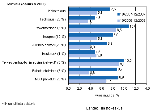Palkkasumman vuosimuutos ajanjaksolla 10/2007-12/2007 ja 10/2006-12/2006, %