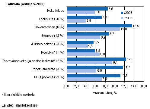 Palkkasumman vuosimuutos ajanjaksolla I/2008 ja I/2007, %