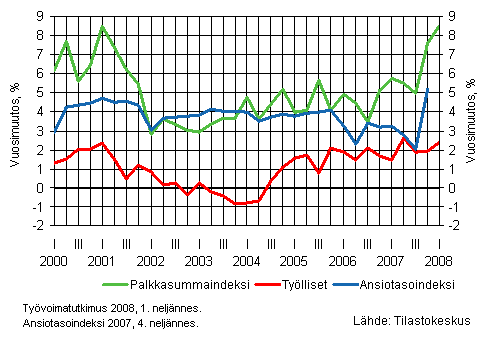 Palkkasumman kasvu on pysytellyt vuoden 2002 alusta lähtien usean vuoden ajan 3 - 6 prosentin välillä neljännesvuosittain tarkasteltuna. Vuoden 2004 alussa palkkasummaa kasvattivat voimakkaasti ensimmäisellä vuosineljänneksellä maksetut tulospalkkiot. Vuonna 2005 tulospalkkioiden vaikutus palkkasumman kasvuun näkyi vuoden kolmannen neljänneksen kasvussa. Vuoden 2006 ensimmäisen ja viimeisen neljänneksen kasvuluvut ylsivät noin 5 prosenttiin. Toisen ja kolmannen vuosineljänneksen kehityksessä jäätiin hieman tästä. Vuoden 2007 viimeisestä neljänneksestä alkaen palkkasumman kasvuvauhti on nopeutunut merkittävästi. Vuoden 2007 viimeisellä neljänneksellä palkkasumma ponnahti 7,6 prosentin kasvuun. Kasvu on jatkunut vuoden 2008 ensimmäisellä vuosineljänneksellä, jolloin koko talouden palkkasumman kohosi 8,5 prosenttia. Kasvun taustalla on monilla toimialoilla voimaan astuneiden uusien työehtosopimusten aikaansaamat korotukset.