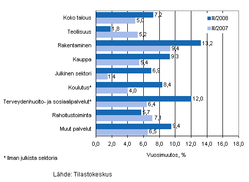 Palkkasumman vuosimuutos ajanjaksolla III/2008 ja III/2007, %