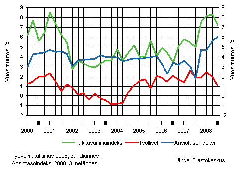Vuoden 2007 viimeisestä neljänneksestä alkaen palkkasumman kasvuvauhti on nopeutunut merkittävästi. Tuolloin palkkasumma ponnahti 7,5 prosentin kasvuun. Kasvun taustalla on sekä palkkasummassa että ansiotason kehityksessä näkyvät uusien työehtosopimusten mukaiset korotukset. Palkkasumman vahva kasvukehitys on jatkunut edelleen vuoden 2008 aikana. Vuoden 2008 ensimmäisellä ja toisella vuosineljänneksellä palkkasumman lisäys oli 8 prosentin luokkaa. Kuluvan vuoden kolmannella neljänneksellä palkkasumman kasvu (7,2 %) tasaantui hieman edeltäneistä vuosineljänneksistä. Samaan aikaan palkansaajien ansiot kohosivat 6,1 prosenttia, kun taas työllisten määrän kasvu hidastui yhteen prosenttiyksikköön.