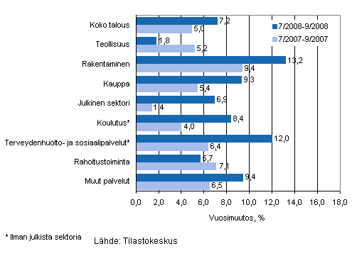 Koko talouden palkkasumma oli heinä-syyskuussa 7,2 prosenttia suurempi kuin vuotta aiemmin vastaavana ajanjaksona. Kasvu nopeutui verrattuna edellisen vuoden heinä-syyskuuhun, jolloin palkkasumman muutos oli 5 prosenttia vuotta aiemmasta.