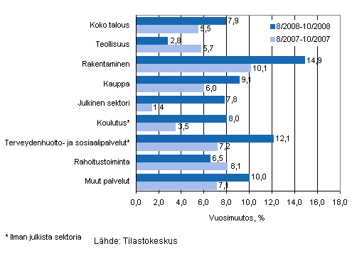 Palkkasumman vuosimuutos ajanjaksolla 8/2008-10/2008 ja 8/2007-10/2007, %
