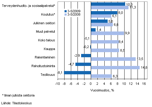 Palkkasumman vuosimuutos ajanjaksolla 3-5/2009 ja 3-5/2008, % (TOL 2008)