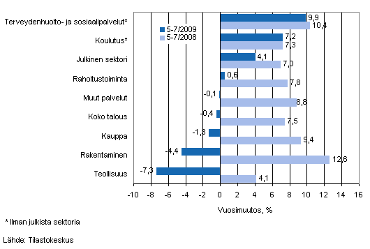 Palkkasumman kasvu hidastui tai palkkasumma laski kaikilla päätoimialoilla touko-heinäkuussa. Voimakkaimmin koko talouden palkkasumman kehitystä jarrutti teollisuuden (- 7,3 %) ja rakentamisen (-4,4 %) palkkasummien lasku. Laskua kertyi myös kaupan ja muiden palveluiden toimialoilla, rahoitustoiminnan palkkasumman ollessa hieman vuoden takaista suurempi. Koulutuspalveluja tarjoavalla yksityisellä sektorilla ja yksityisissä terveyden huolto ja sosiaalipalveluissa yllettiin lähes edellisvuoden kasvulukemiin.