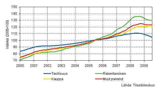 Palkkasumman trendit toimialoittain 8/2009 (TOL 2008)
