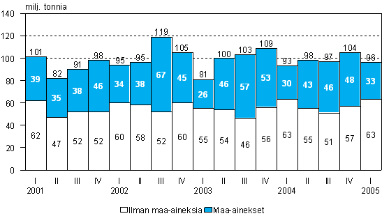 Kuorma-autoilla kotimaan tieliikenteessä kuljetettu tavaramäärä kasvoi vuoden 2005 ensimmäisellä neljänneksellä 3 prosenttia vuoden 2004 vastaavaan ajanjaksoon verrattuna. Maa-aineskuljetukset lisääntyivät 8 prosenttia ja muiden tavaroiden kuljetukset kasvoivat prosentin. Kuorma-autojen kuljetussuorite sen sijaan väheni 5 prosenttia edellisvuodesta. Tiedot ilmenevät Tilastokeskuksen laatimasta kotimaan tieliikenteen tavarankuljetustilastosta.