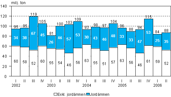 Varutransporterna med lastbil inom inrikes vägtrafik minskade med en procent under det andra kvartalet 2006 jämfört med motsvarande period år 2005. Transport av jordmaterial ökade med 9 procent, medan transport av andra varor minskade med 6 procent från året innan. Uppgifterna framgår av Statistikcentralens statistik över varutransporter inom inrikes vägtrafik.