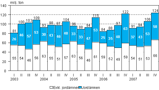 I oktober-december 2007 uppgick varutransporterna med lastbil till totalt 124 miljoner ton. Volymen av transporter av jordmaterial var 58 miljoner ton. Transport av andra varor uppgick totalt till 66 miljoner ton. Transport av jordmaterial minskade med 7 procent, men transport av andra varor ökade med 11 procent från året innan. Lastbilarnas transportarbete var 6 931 miljoner tonkilometer.