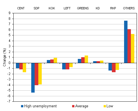 Changes in support for parties in Uusimaa in districts with different levels of unemployment