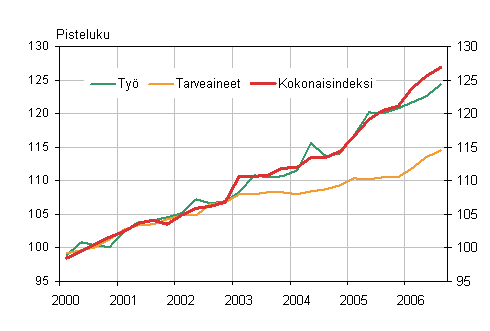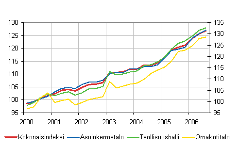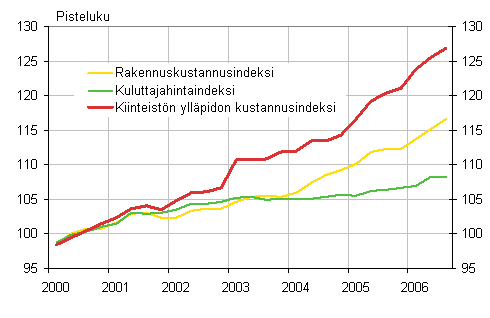 Kiinteistön ylläpidon kustannusindeksi nousi vuoden 2006 kolmannella neljänneksellä edellisen vuoden vastaavasta neljänneksestä 5,3 prosenttia. Talotyypeittäin tarkasteltuna eniten nousivat asuinkerrostalon ylläpitokustannukset 6,0 prosentilla, toimistorakennuksen 5,4 prosentilla ja myymälärakennuksen sekä teollisuushallin ylläpidon kustannukset 4,9 prosentilla. Kokonaisindeksiin sisältymätön omakotitalon indeksi osoittaa ylläpidon kustannusten nousseen 5,2 prosenttia heinä-syyskuussa vuoden takaiseen verrattuna.