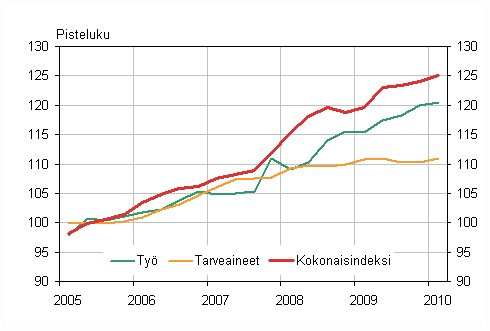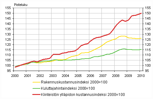 Kiinteistön ylläpidon kustannukset nousivat vuoden 2010 ensimmäisellä neljänneksellä edellisen vuoden vastaavasta neljänneksestä 4,6 prosenttia. Talotyypeittäin tarkasteltuna eniten nousivat teollisuushallien ylläpitokustannukset, 5,5 prosenttia. Asuinkerrostalojen ylläpitokustannukset nousivat 4,5 prosenttia, myymälärakennusten 3,7 prosenttia, toimistorakennusten 3,7 prosenttia, terveyskeskusten 4,7 prosenttia ja koulurakennusten 5,1 prosenttia. Omakotitalon ylläpitokustannukset nousivat 4,6 prosenttia vuoden 2010 tammi-maaliskuussa vuoden 2009 vastaavaan ajanjaksoon verrattuna. Omakotitalo ei sisälly kiinteistön ylläpidon kustannusindeksin kokonaisindeksiin.