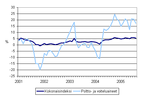 Linja-autoliikenteen kaikkien kustannusten sekä poltto- ja voiteluainekustannusten vuosimuutokset 1/2001 - 8/2005