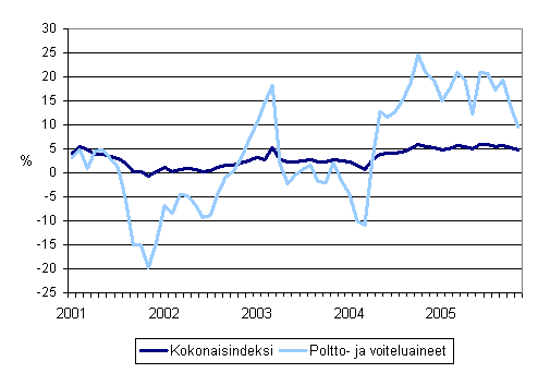 Linja-autoliikenteen kaikkien kustannusten sekä poltto- ja voiteluainekustannusten vuosimuutokset 1/2001 - 12/2005
