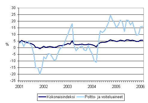 Eniten kokonaisindeksin nousuun vaikuttivat palkkojen ja välillisten palkkojen korotukset sekä poltto- ja voiteluaineiden kallistuminen. Poltto- ja voiteluaineiden hinnat kohosivat vuodessa runsaat 16 prosenttia, palkat ja välilliset palkat 4,4 prosenttia.