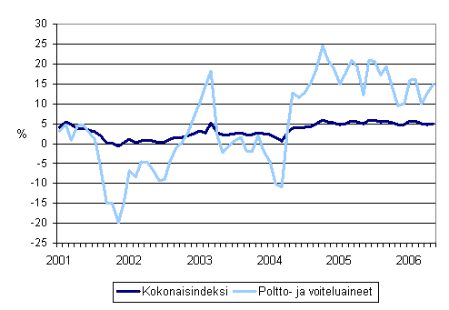 Linja-autoliikenteen kaikkien kustannusten sekä poltto- ja voiteluainekustannusten vuosimuutokset 1/2001 - 5/2006
