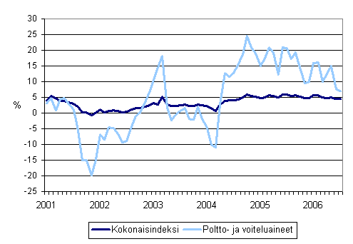 Linja-autoliikenteen kaikkien kustannusten sekä poltto- ja voiteluainekustannusten vuosimuutokset 1/2001 - 7/2006