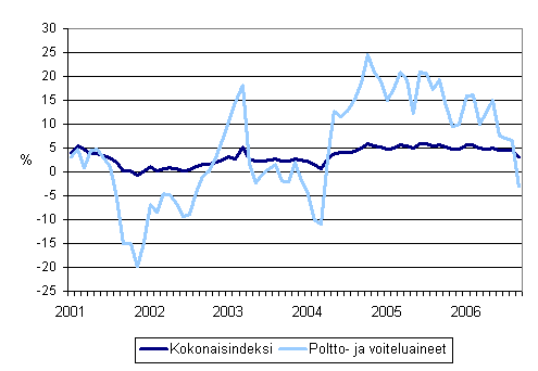 Linja-autoliikenteen kaikkien kustannusten sekä poltto- ja voiteluainekustannusten vuosimuutokset 1/2001 - 9/2006