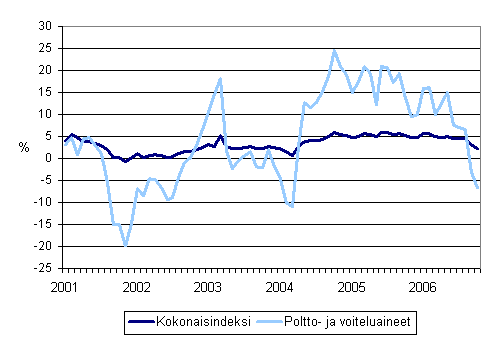 Linja-autoliikenteen kaikkien kustannusten sekä poltto- ja voiteluainekustannusten vuosimuutokset 1/2001 - 10/2006