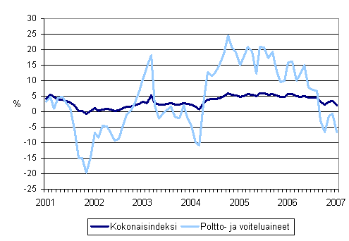 Linja-autoliikenteen kaikkien kustannusten sekä poltto- ja voiteluainekustannusten vuosimuutokset 1/2001 - 1/2007