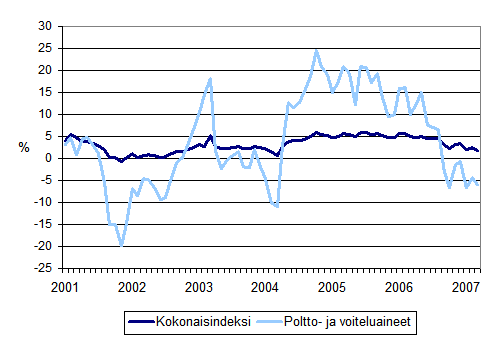 Linja-autoliikenteen kaikkien kustannusten sekä poltto- ja voiteluainekustannusten vuosimuutokset 1/2001 - 3/2007