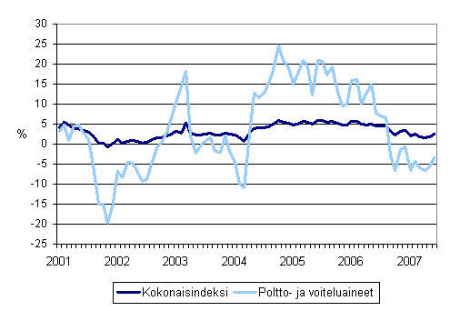 Linja-autoliikenteen kaikkien kustannusten sekä poltto- ja voiteluainekustannusten vuosimuutokset 1/2001 - 6/2007