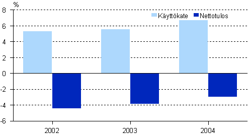 Vesiliikenteen kannattavuus pysytteli edellisvuoden tasolla. Käyttökate oli 10 prosenttia liiketoiminnan tuotoista. Päätoimialojen välillä kehitys oli kuitenkin päinvastainen. Ulkomaan henkilöliikenteen käyttökateprosentti laski 10 prosentista vajaaseen 8 prosenttiin. Samanaikaisesti ulkomaan tavaraliikenteessä käyttökateprosentti nousi 11 prosentista 13 prosenttiin liiketoiminnan tuotoista. Tämän lisäksi tavaraliikennettä harjoittavien varustamoiden yhteenlaskettu nettotulos kasvoi rahoitustuottojen ja veronpalautusten johdosta 14 prosenttiyksiköllä. Kokonaistasolla vesiliikenteen nettotulos nousi vajaasta kahdesta 5 prosenttiin liiketoiminnan tuotoista.