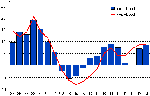 - Luottokannan kehitys 1985-2004, muutos edellisestä vuodesta, % (20.6.2005)