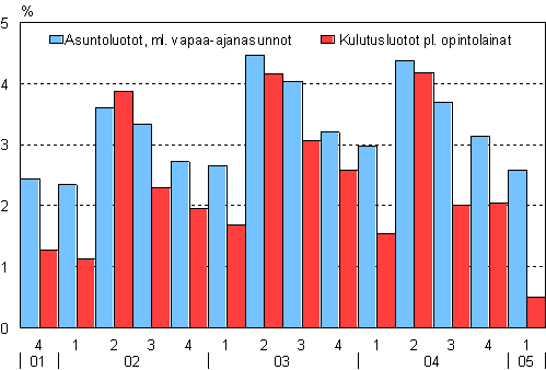 Kotitalouksien asunto- ja kulutusluottokannan muutos edellisestä neljänneksestä, %