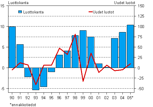Kotimaisten rahoitus- ja vakuutuslaitosten, valtion ja sosiaaliturvarahastojen myöntämä luottokanta oli vuoden 2005 lopussa yhteensä 200 miljardia euroa. Luottokanta kasvoi runsaat 10 prosenttia vuoden aikana. Myös uusien luottojen nostot kasvoivat vuoden aikana lähes 10 prosenttia. Uusia luottoja nostettiin viime vuonna yhteensä 139 miljardilla eurolla. Tiedot käyvät ilmi Tilastokeskuksen luottokantatilaston ennakkotiedoista.