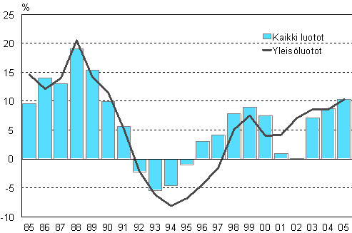 Luottokannan ja yleisöluottokannan kehitys vuosina 1985-2005, muutos edellisestä vuodesta, %