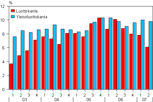 Luottokannan ja yleisöluottokannan kehitys neljänneksittäin vuosina 2003-2007, muutos edellisen vuoden vastaavasta neljänneksestä, %