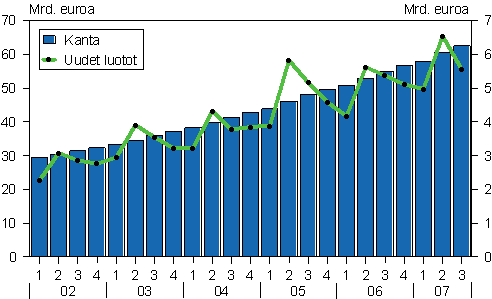 Kotitalouksien asuntoluottokanta ja uudet asuntoluotot (ml. vapaa-ajan asunnot) neljänneksittäin vuosina 2002-2007, mrd. euroa