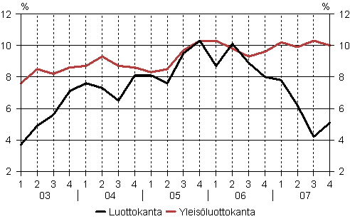 Luottokannan ja yleisöluottokannan kehitys neljänneksittäin vuosina 2003-2007, muutos edellisen vuoden vastaavasta neljänneksestä, %