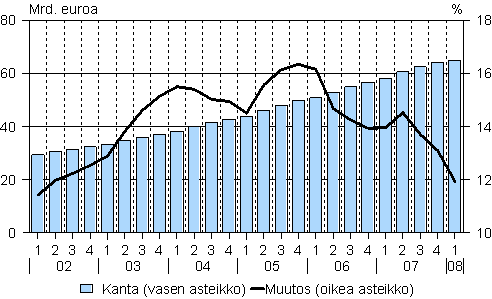 Kotitalouksien asuntoluottokanta ja sen muutos edellisen vuoden vastaavasta neljänneksestä (ml. vapaa-ajan asunnot) neljänneksittäin vuosina 2002-2007
