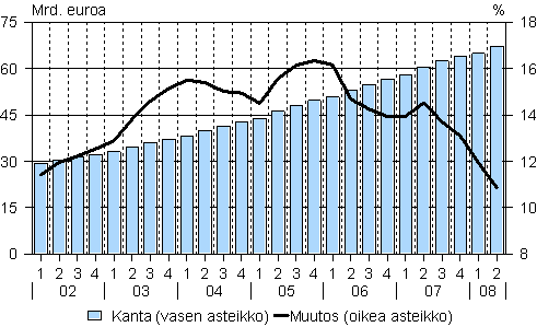 Kaikkien luotonsaajien yhteenlaskettu luottokanta oli vuoden 2008 toisen neljänneksen lopussa yhteensä vajaat 239 miljardia euroa. Luottokanta kasvoi edellisen vuoden vastaavaan neljännekseen verrattuna kahdeksan prosenttia. Uusia luottoja nostettiin neljänneksen aikana yhteensä vajaalla 47 miljardilla eurolla, vajaat 10 prosenttia enemmän kuin vastaavalla neljänneksellä vuotta aiemmin.