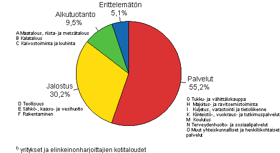 Yritystoiminnan1) luottokanta luotonsaajan toimialaryhmän mukaisesti, %, yhteensä 65,0 miljardia euroa