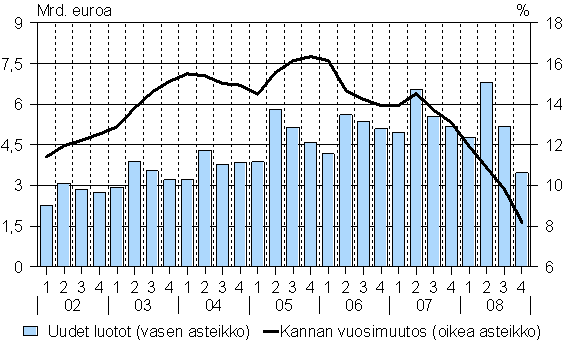 Kotimaisten rahoitus- ja vakuutuslaitosten, valtion ja sosiaaliturvarahastojen kotitalouksille myöntämien luottojen määrä oli yhteensä runsaat 93 miljardia euroa vuoden 2008 lopussa. Kotitalouksien luottokanta kasvoi vuoden aikana vajaat kahdeksan prosenttia. Kotitalouksien luottokannasta asunto- ja vapaa-ajan asuntoluottoja oli yli 69 miljardia euroa, runsaat kahdeksan prosenttia enemmän kuin vuotta aiemmin. Kotitalouksien asuntoluottokannan vuotuinen kasvuvauhti on puolittunut vuoden 2005 huippulukemista. Kotitaloudet nostivat vuoden 2008 aikana uusia asuntoluottoja yhteensä runsaat 20 miljardia euroa eli yhdeksän prosenttia vähemmän kuin edellisvuonna. Kulutusluottoja ja opintolainoja kotitalouksilla oli vuoden lopussa vajaat 15 miljardia euroa. Tiedot käyvät ilmi Tilastokeskuksen luottokantatilastosta.