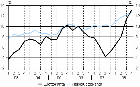 Luottokannan ja yleisöluottokannan kehitys neljänneksittäin vuosina 2003-2008, muutos edellisen vuoden vastaavasta neljänneksestä, %