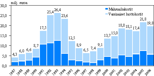 Luottotappiot luottokorttitileistä vuosina 1987-2006, milj. euroa
