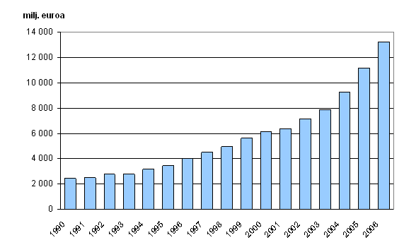 Luottokorttimyynti kotimaassa vuosina 1990-2006, miljoonaa euroa
