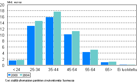 Kotimaisten pankkien asiakkaiden euroluotot ikäryhmittäin 31.12.2004