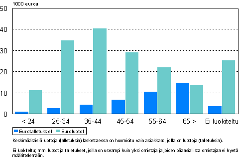Kotimaisten pankkien euroluotot fyysisille henkilöille keskittyvät noin 40-vuotiaille, joilla on lainaa keskimäärin hieman yli 40 000 euroa jokaista lainanottajaa kohden. Keskimääräiset talletukset taas karttuvat ikäryhmittäin. Yli 65-vuotiaat ovat ensimmäinen ikäryhmä, joilla on talletuksia jokaista tallettajaa kohden keskimäärin enemmän kuin lainaa jokaista lainanottajaa kohden. Tiedot ilmenevät Tilastokeskuksen luottolaitosten vuoden 2004 tuloslaskelmia ja taseita koskevista tiedoista.
